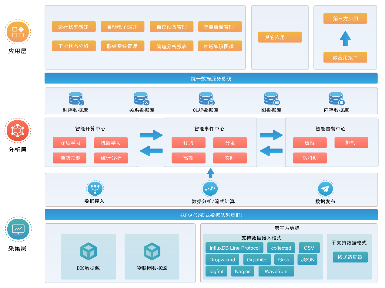 油氣田大數(shù)據(jù)智能分析軟件通過工業(yè)常用的通訊協(xié)議,對氣田井站、管道、儀表、附屬設(shè)施工業(yè)生產(chǎn)現(xiàn)場的進(jìn)行在線分析和智能監(jiān)控,實現(xiàn)實時數(shù)據(jù)采集、在線診斷、一體化管理、風(fēng)險提前預(yù)警、故障快速定位,輔助提升氣田生產(chǎn)運維人員工作效率,保障氣田生產(chǎn)穩(wěn)定運行。主要提供五大基礎(chǔ)功能,六項專業(yè)能力。